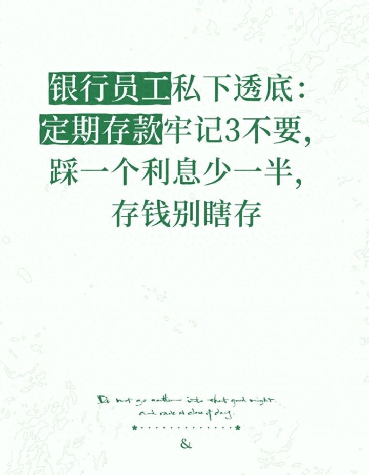 不少人觉得存定期很简单,拿着钱去银行柜台,选个期限存进去就行,殊不知里面藏着不少门道。一位在银行工作多年的老员工私下透露,定期存款看着简单,实则要牢记“3不要”,这都是储户踩坑踩出来的经验,踩中一个就可能让利息少一半,很多人年年存钱年年亏,还不知道问题出在哪。今天就用大白话跟大家把这3个禁忌讲透,再补充几个存钱技巧,让你存定期既能保本,又能把利息拿到手,再也不白吃亏。